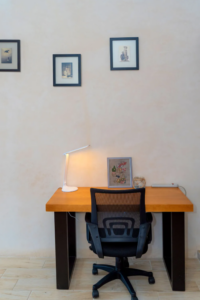 Amenities include linen and towels, security box, Smart TV, smoke alarm, and fast WiFi modem, ideal for remote work. A work desk with an exclusive chair is also provided.